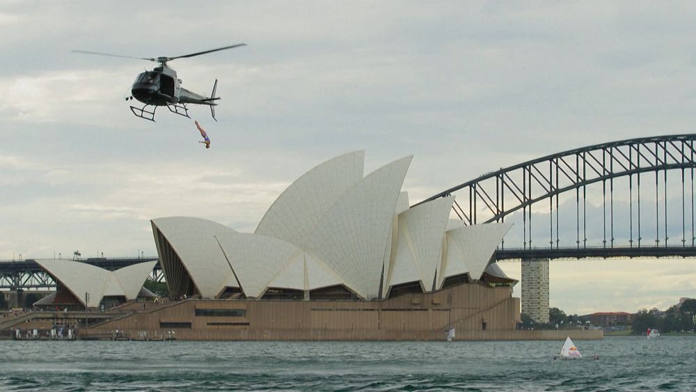 Diving from a helicopter: Rhiannan Iffland takes the plunge in Sydney Bay